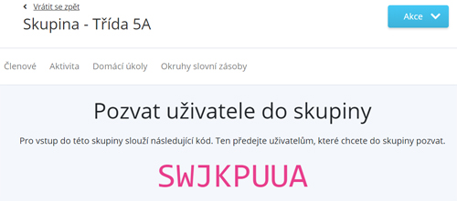 Stisknutím tlačítka Akce v pravém horním rohu a výběrem Pozvat do skupiny si zobrazíte heslo pro vstup do skupiny.