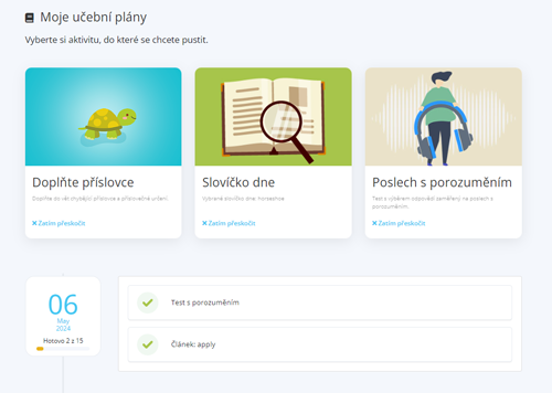 Jak to funguje? Uživateli doporučujeme vždy tři různé aktivity, ze kterých si může vybrat. Pokaždé, když jednu aktivitu dokončí, výběr se doplní novou aktivitou. Je tedy neustále z čeho vybírat. V oběhu jsou např. aktivity Slovíčka pro vás, Poslech s porozuměním, Obecný test ABCD, Překladová doplňovačka, Slovíčko dne, Články o gramatice/slovní zásobě a mnoho dalšího. Vše je šité na míru uživateli a jeho úrovni, včetně např. Slovíčka dne (zde vybíráme z naší mnohaleté historie a volíme slova, která mají úroveň odpovídající nastavení uživatele).